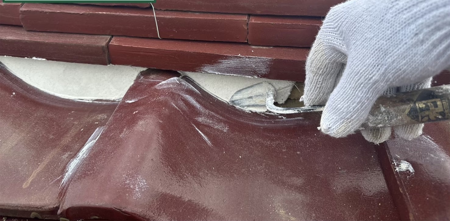 棟瓦を固定している漆喰が剥がれ落ちていました。